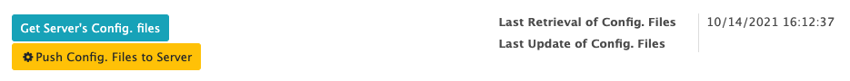 Le principe est de saisir les fichiers de configuration depuis Muppy et de les envoyer dans le Cluster. Si nécessaire, il est aussi possible de récupérer le contenu des fichiers de configuration présent dans un Cluster. C'est le rôle des 2 boutons suivants présents en entête du formulaire Database Cluster. En face de chaque bouton, Muppy affiche le timestamp de la dernière récupération et de la dernière mise à jour des fichiers de configuration du serveur.