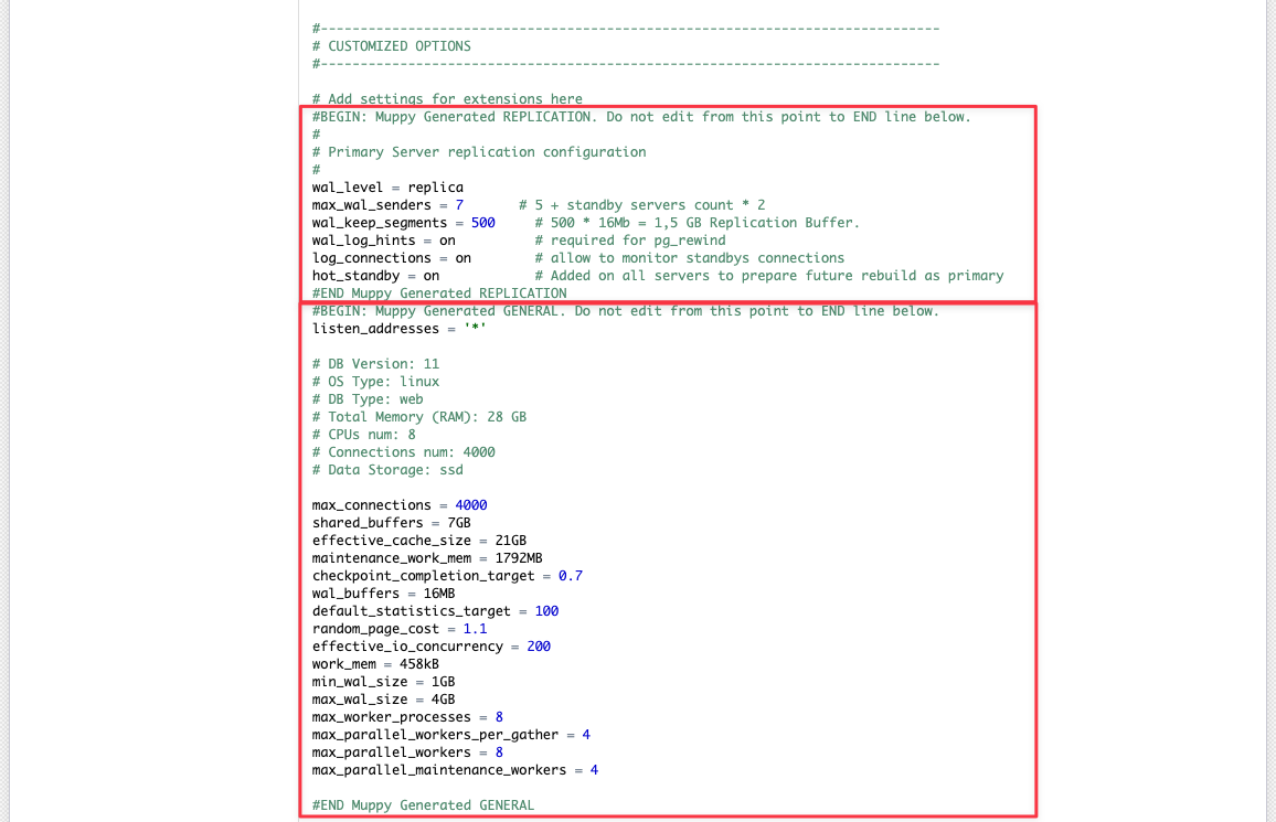 Les zones suivantes affichent le contenu des fichiers de configuration postgresql.conf et postgresl.auto.conf tels qu'ils sont présents dans le serveur.