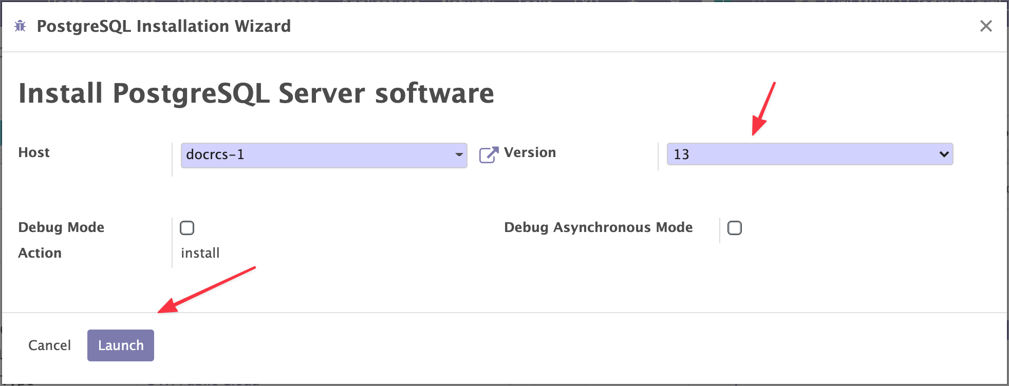de l'onglet PostgreSQL, le PostgreSQL Installation Wizard s'ouvre. Sélectionnez la version, puis cliquez sur le bouton Launch.
