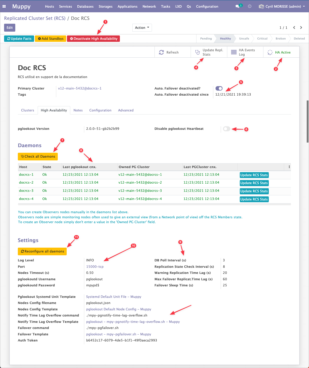 Muppy utilise pglookout (https://github.com/aiven/pglookout) pour gérer la HA des RCS.