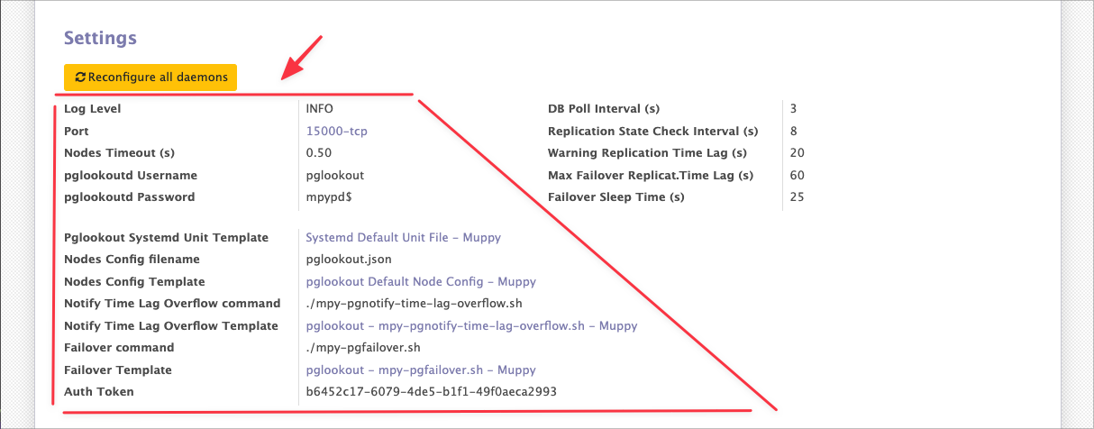 Pour ces paramètres, nous vous invitons à vous référer à l'aide contextuelle, à la documentation de pglookout et à la Prestation d'Accompagnement de votre Contrat muppy.io