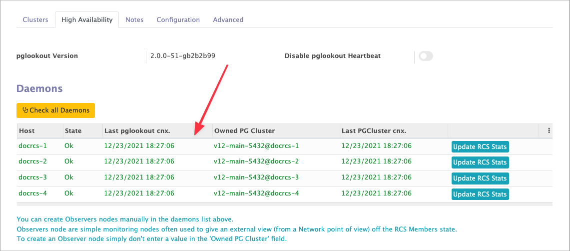 Une fois que l'exécution des Tasks est terminée, vous pouvez vérifier l'état de chaque pglookout en ouvrant son formulaire depuis la liste de Daemons présente dans l'onglet "High Availability"