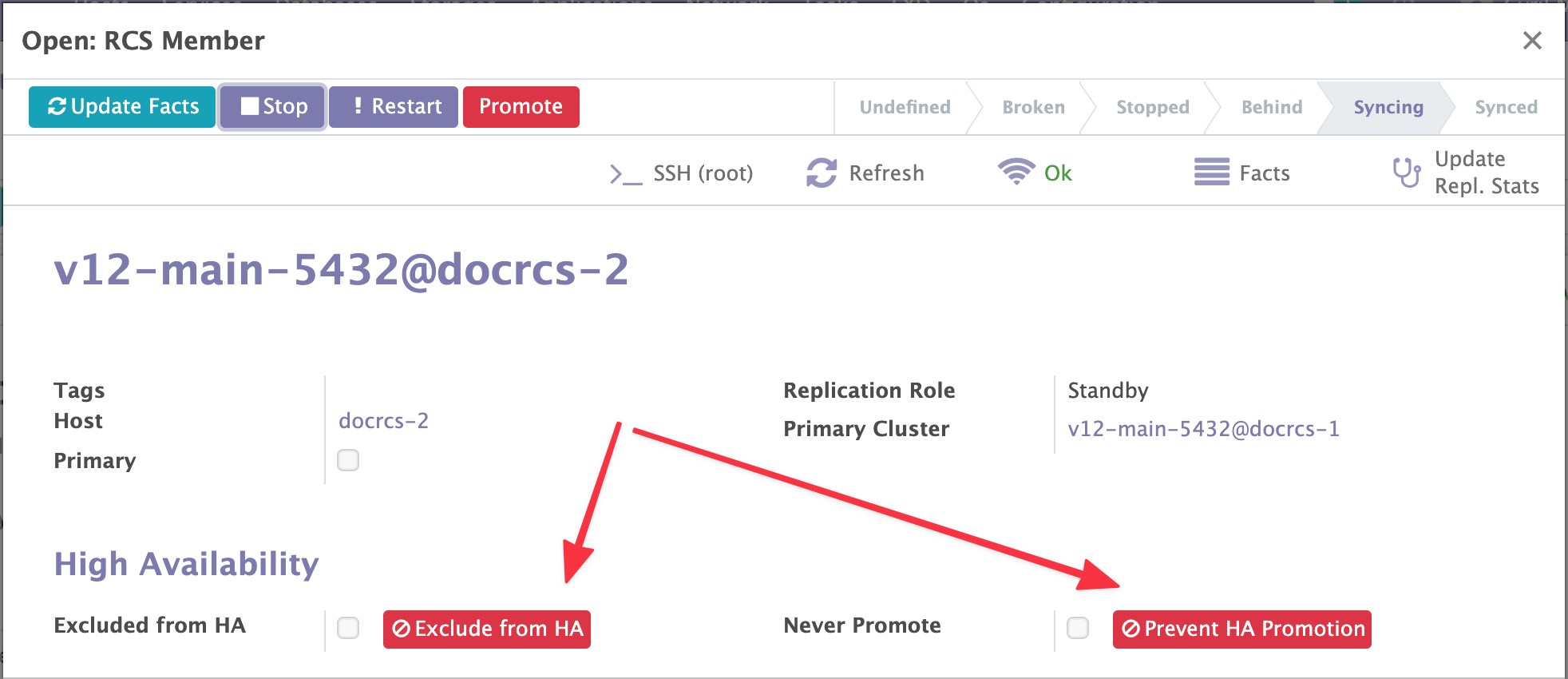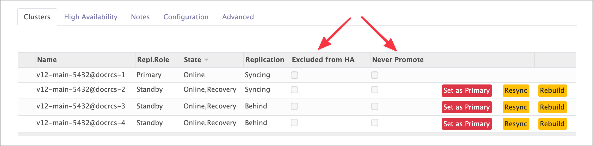 - Excluded From HA ; Muppy n'installera pas de daemon pglookout sur le Cluster. Les Statistiques de ce Cluster ne seront donc pas collectées et le Cluster ne pourra pas être promu (cela implique Never Promote = True)