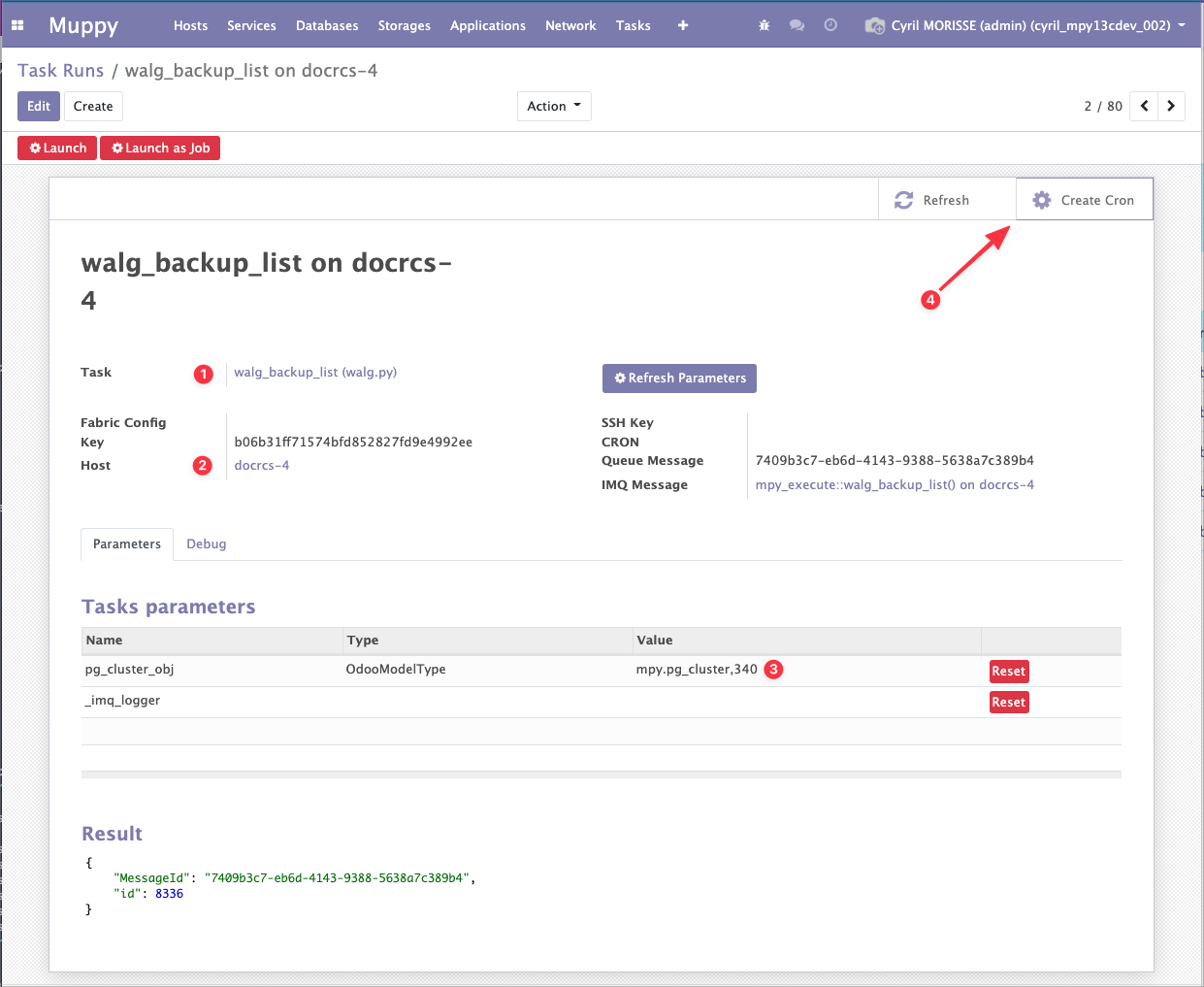 Dans ce cas, la Muppy Task walg_backup_list doit être exécutée périodiquement (après les backups) pour actualiser la liste des Clusters Backups dans Muppy.