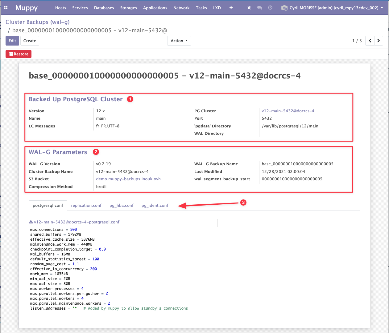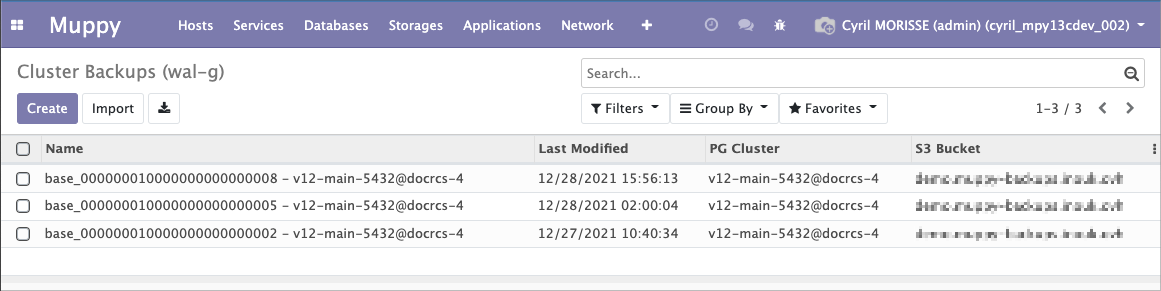 - Via le menu Muppy / Databases / PostgreSQL / Cluster Backups (WAL-G)