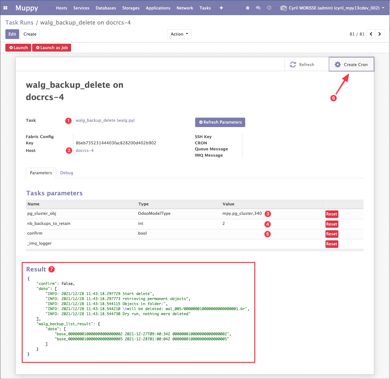 La Muppy Task walg_backup_delete purge les fichiers de backups et actualise la liste des Clusters Backups (WAL-G) à l'issue de la purge.
