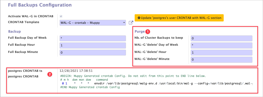 Muppy n'écrase pas le CRONTAB du user postgres mais injecte un bloc contenant les commandes nécessaires à la purge des Backups WAL-G (Cf. figure précédente).