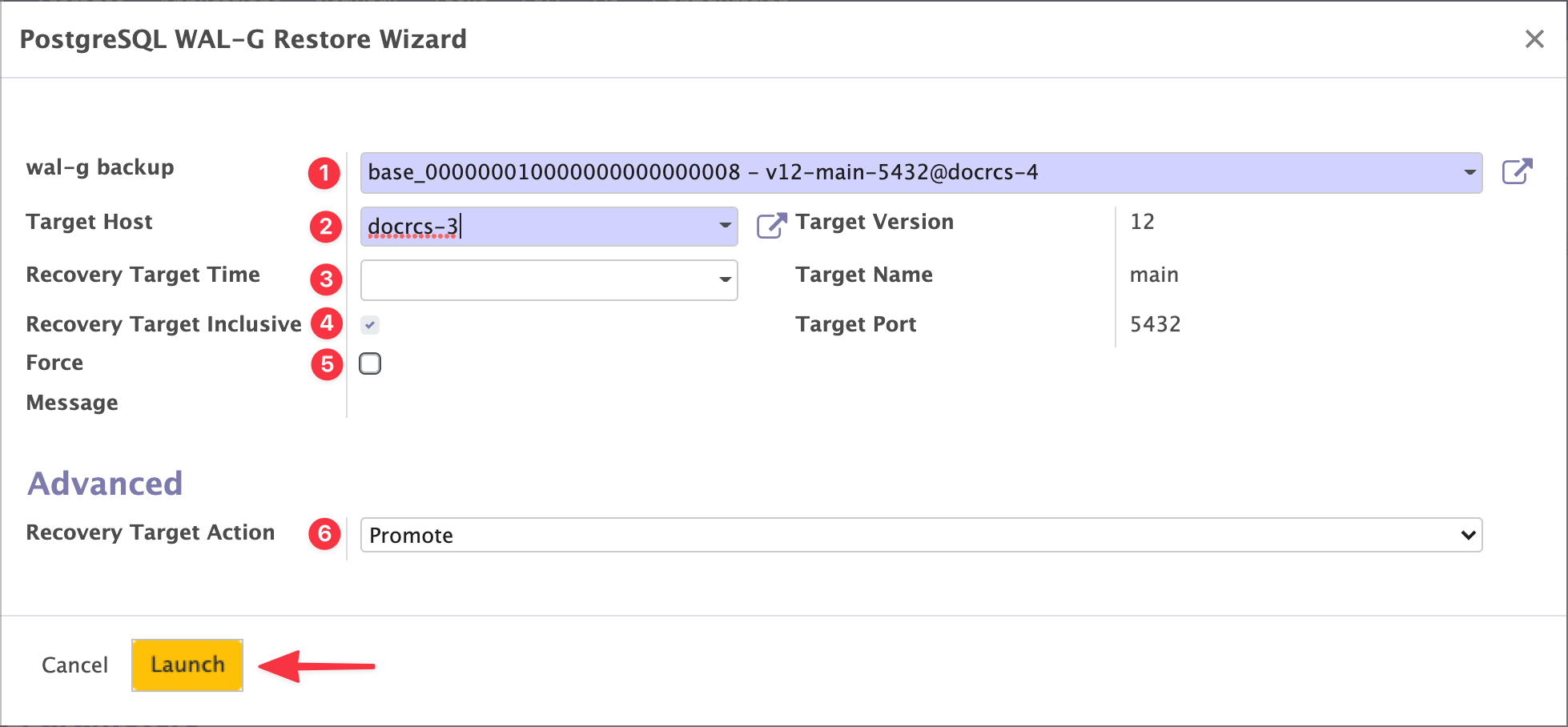 - Définir si vous voulez restaurer le Cluster dans l'état où il était juste avant le PITR ou juste après.