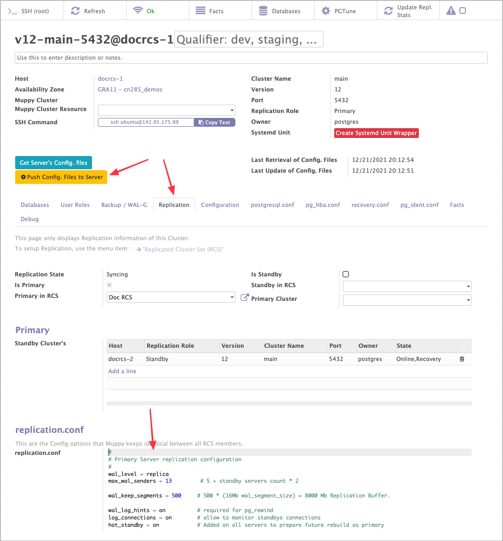 Modifier la valeur de postgresql.conf dans le formulaire des Clusters (en commencant par le Primary) et mettez à jour la configuration avec
