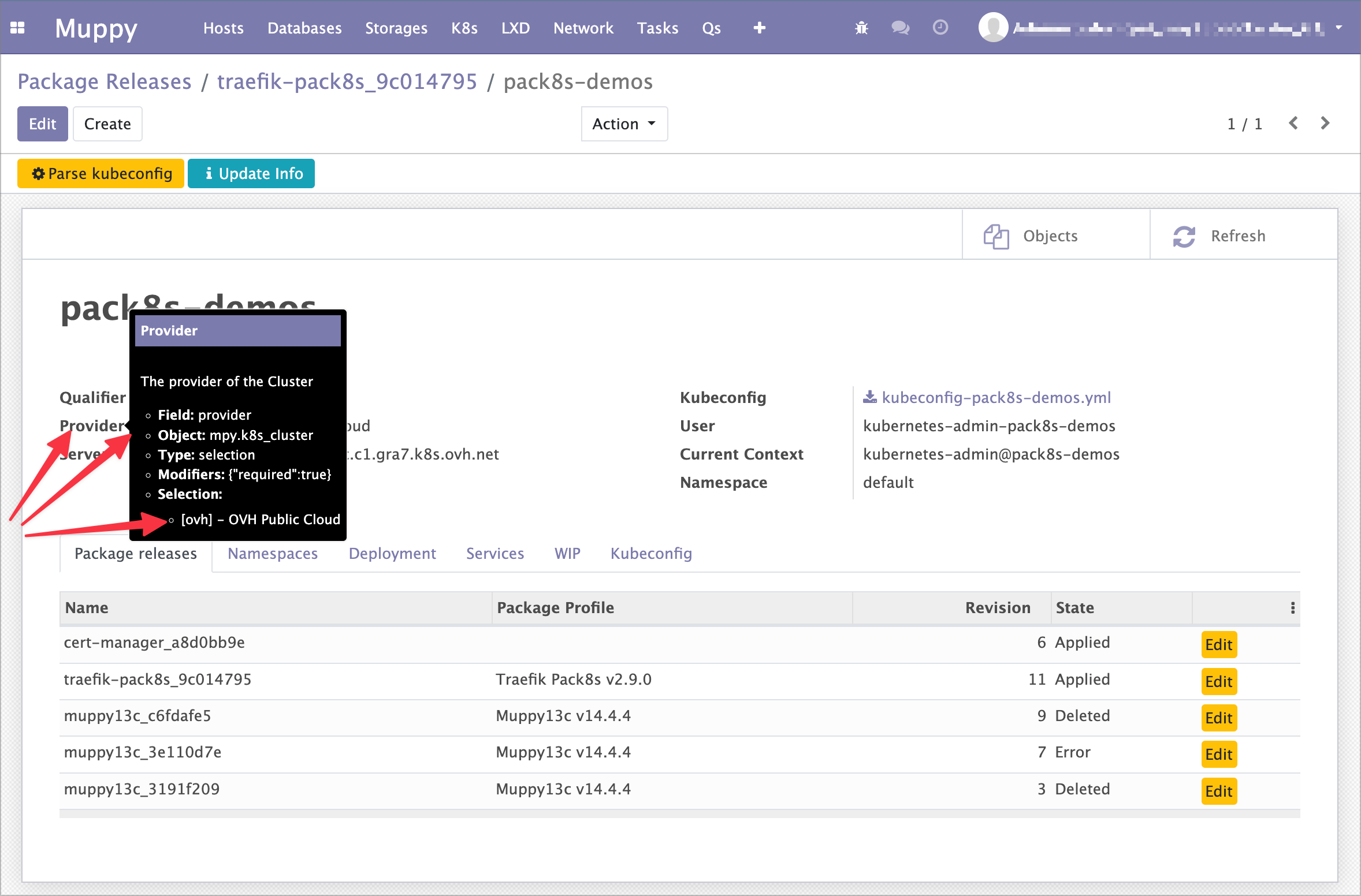 Par exemple: {{ obj.k8s_cluster_id.provider }} permet de récupérer le Provider d'un cluster en partant d'une Package Release.